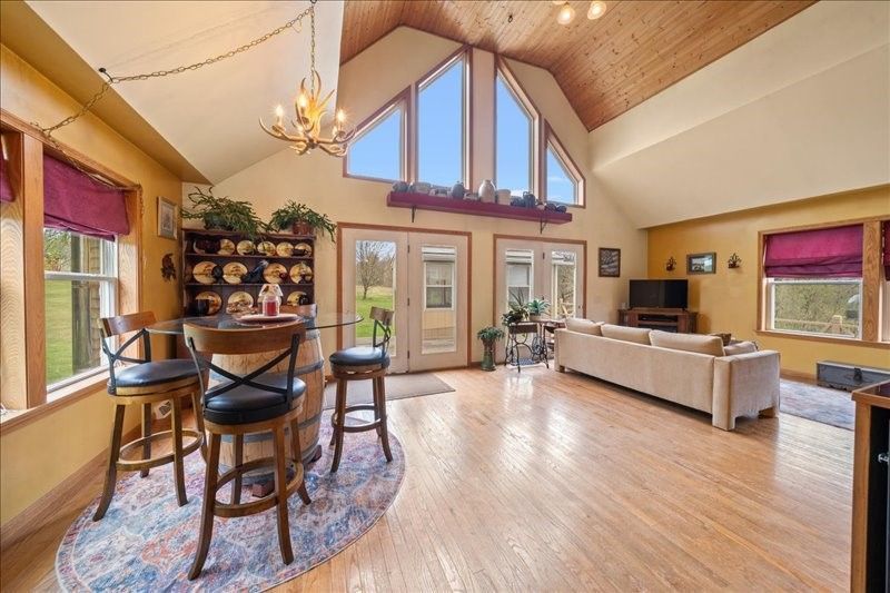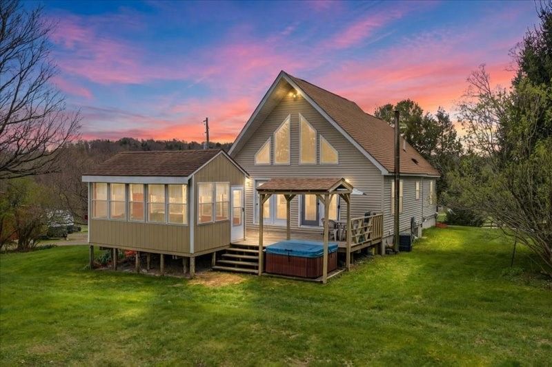 Escape to your own Private Country Retreat! A stunning Chalet-Style home nestled on 12.0 private Acres adjoining State Forest. This property offers a perfect balance of rustic charm and modern comfort across 2200+ square feet of living space. The open-concept kitchen features stainless steel appliances, a wine refrigerator, and flows effortlessly into a bright living and dining area surrounded by beautiful windows that bathe the home with natural light. With three bedrooms and two and a half baths, there is space and flexibility to suit your needs. The walk-out lower level family room has a wood stove and full bath with a walk-in shower, perfect for guests or a recreation area. Enjoy the outdoors in every season with a spacious deck, three-season room, and hot tub, ideal for relaxing and entertaining while taking in the peaceful surroundings of nature. Additional highlights include an attached garage and a barn-workshop equipped with electricity and a wood stove. The acreage offers a blend of open, usable land and a wooded section that is bordering state land. This property perfectly combines privacy, ample space, and direct access to outdoor recreation and adventures.